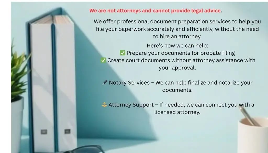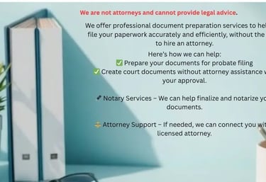 Disclaimer: I am not an attorney and do not offer legal advice or legal representation. I provide non-lawyer document preparation services using public court forms, based solely on the information you gave me. If your case is contested, involves legal questions, or includes significant real estate, I will refer you to a licensed probate attorney.